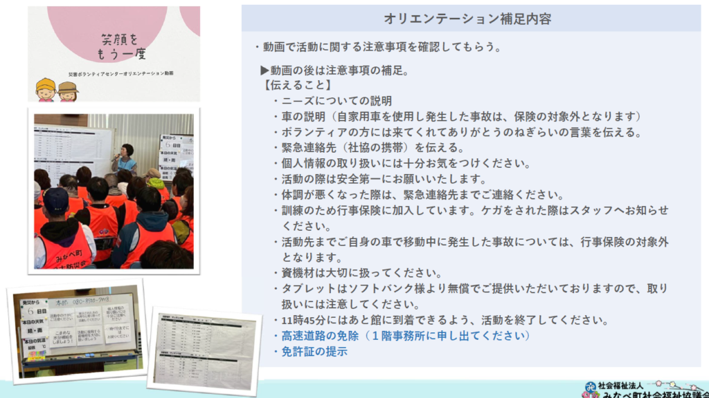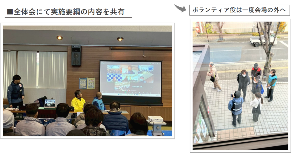・はあと館を拠点に、ボランティア役・運営役に分かれ、災害VC運営訓練を実施する。風水害を想定した訓練となり、ボランティアの活動先は、被災者宅を想定した現地調査もしくは町内の清掃活動のいずれかにご参加いただきました。